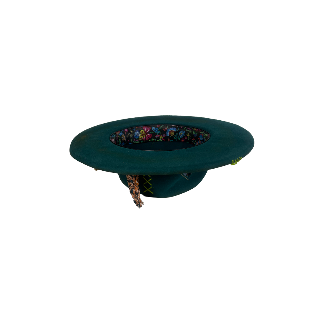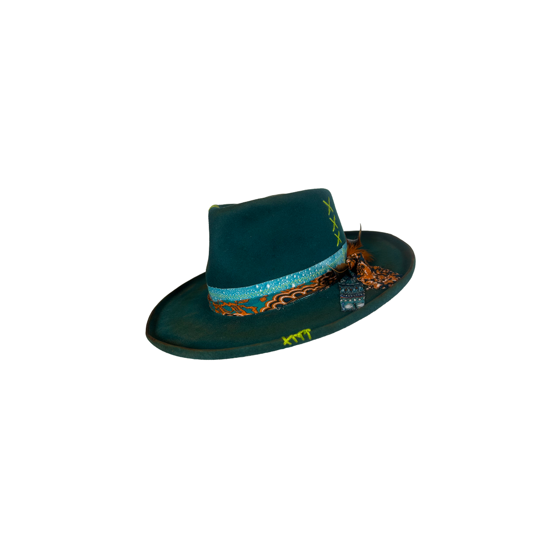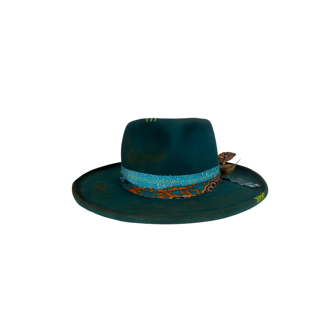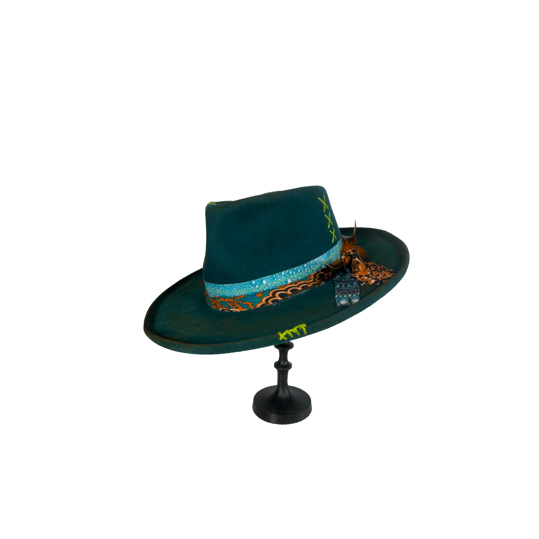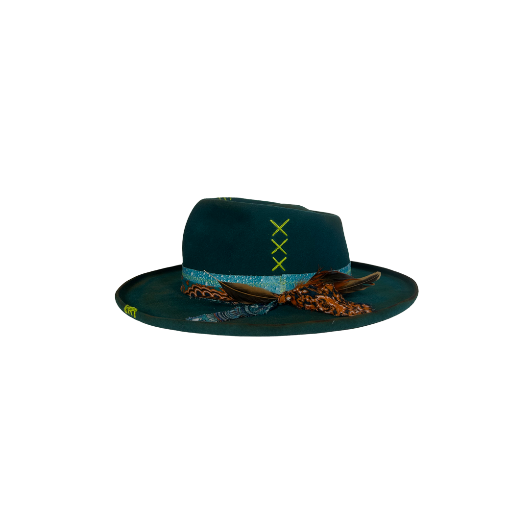 The 3D handmade water-effect band is the whole philosophy in texture — water takes the shape of whatever holds it and loses nothing of itself in the process. That’s you. The layered banding moves the way life does — restless, patterned, never quite the same twice — and the rooster feathers at the knot carry that same wild, unbothered energy of a creature that simply is what it is, fully, without apology. The neon lime cross-stitches on the crown and brim aren’t subtle and they aren’t trying to be — they’re the laugh in the middle of a serious room, the bright thought that cuts through, the part of you that refuses to be fully contained by any one aesthetic.